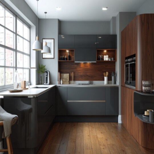 Grey and Walnut Contemporary L Shape Kitchen Design with Extensive Cabinetry